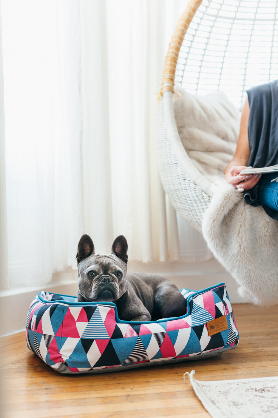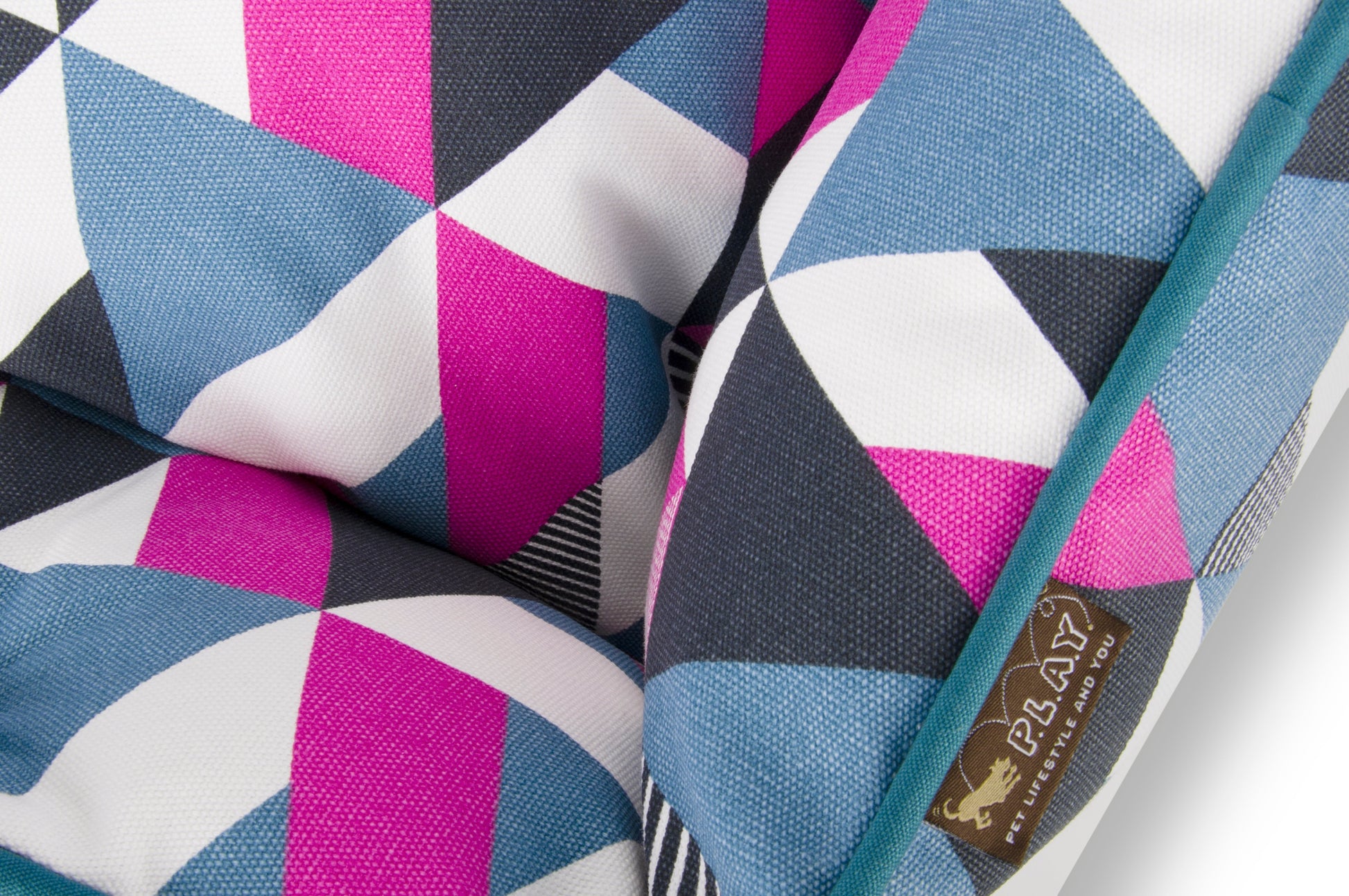 P.L.A.Y.’s Mosaic Soda Pop Lounge Bed is made from 100% natural unique cotton fabric keeping your pup lounging in style all night long.